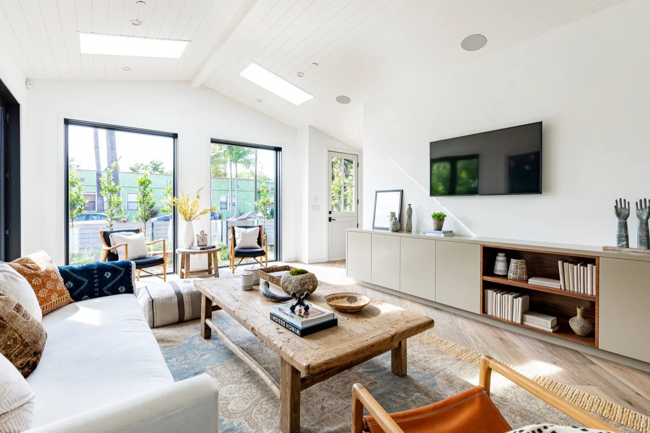 Distinguished by its striking facade; this contemporary three-bedroom, three-bathroom Venice bungalow is thoughtfully crafted with unique elements of design and sophisticated smart systems. The interior concept is a bright, simple, and functional space, expressed by an open plan with elegant walnut floors, custom built-in cabinetry, and an uplifting light-filled ambiance with 10+ foot high ceilings, skylights and large windows.
